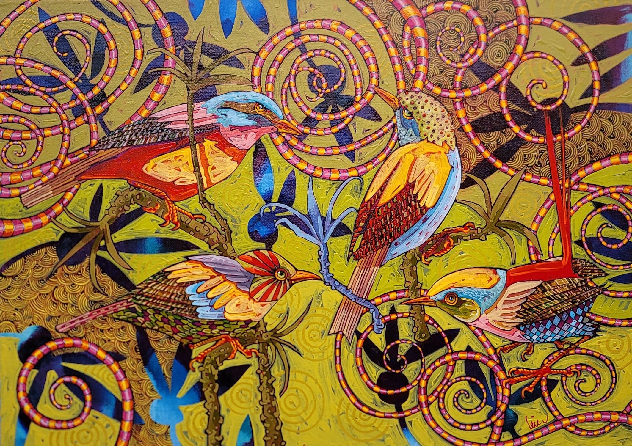 "This exhibition celebrates birds in all of their frenzied beauty, pattern, colour and communication. My most chaoticand detailed work to date, I want the paintings to sing."