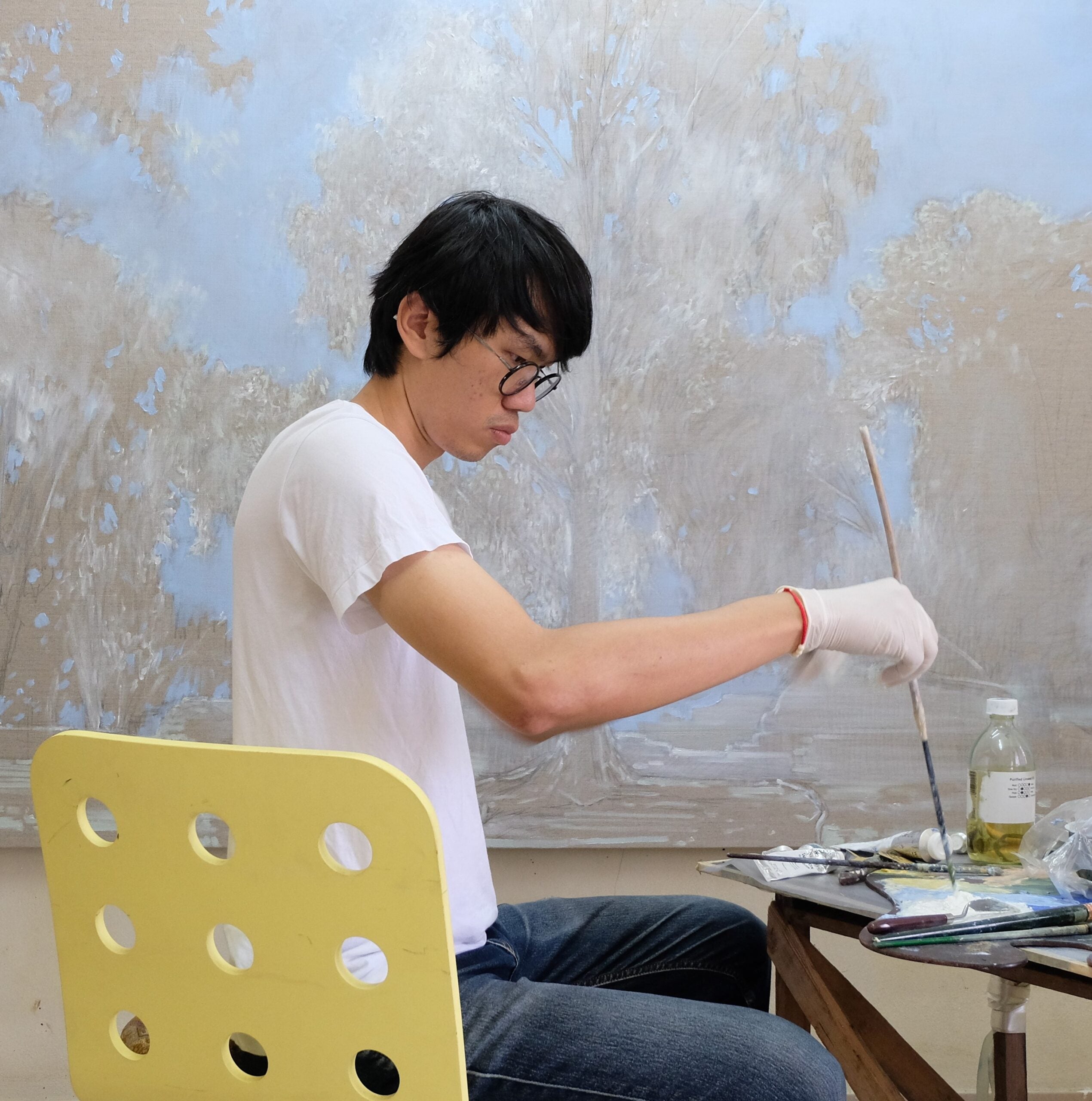 After completing his initial education, Noppanan began presenting his works of ink Chinese landscape paintings on paper that had gone through a repeated line-drawing process using a self-made bamboo brush technique. By drawing inspiration from the shapes of trees, leaves, and the basic structure of natural landscapes, which are simple and fundamental, Noppanan’s artistic philosophy mainly comes from Buddhist and Eastern philosophies. It aims to establish a connection and maintain a balance between individuality and nature, which influences his identity and thoughts.