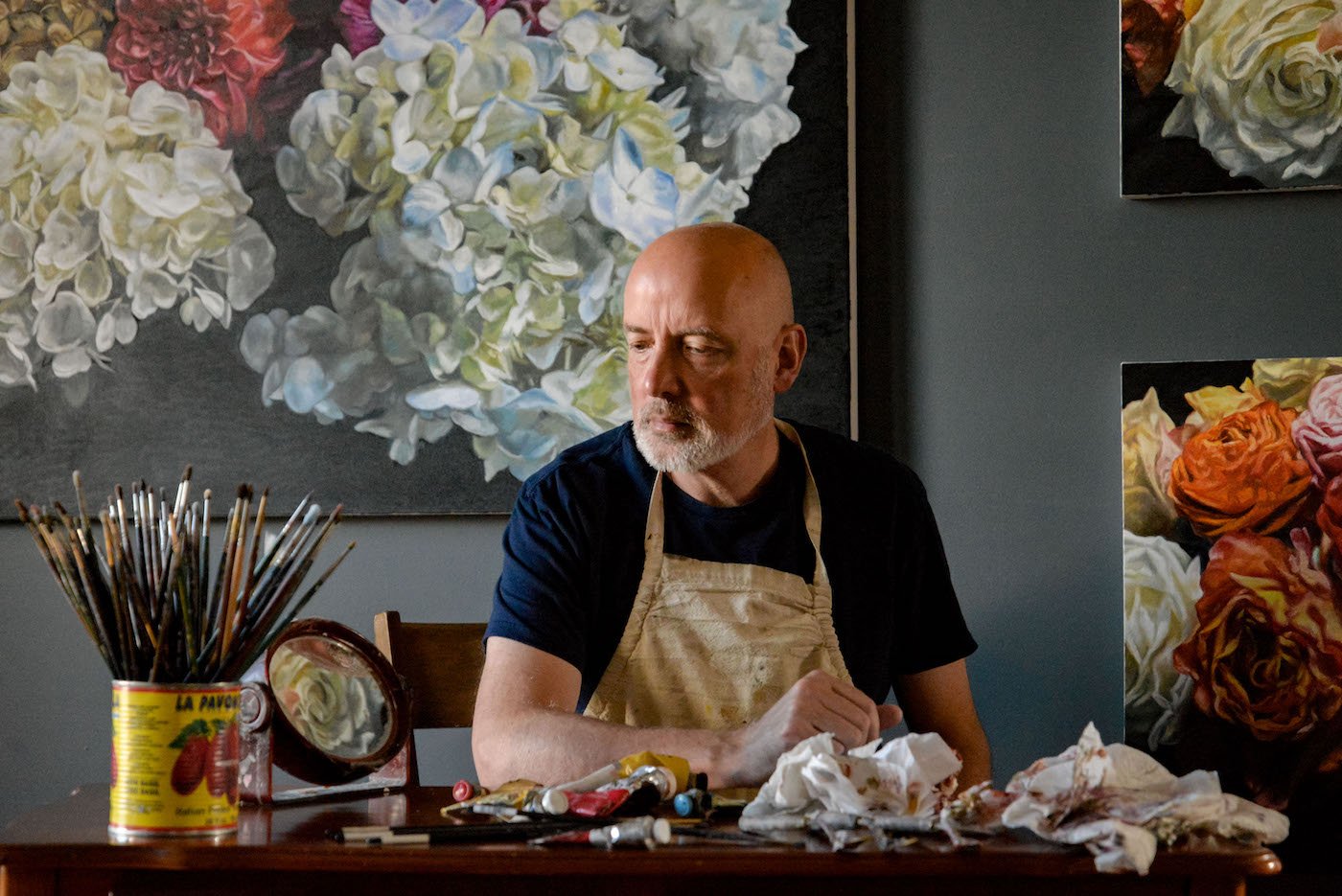 Lemay’s floral compositions capture that feeling you get when you first lean into a bouquet to inhale the scent. He is conscious of creating a level of realism that is poetic while still retaining the illusion for the viewer of being right in that moment. Some passages are more brushy and poetic and others are more detailed. Each painting contains hundreds of these types of choices so that the viewer can be immersed in this floral experience.